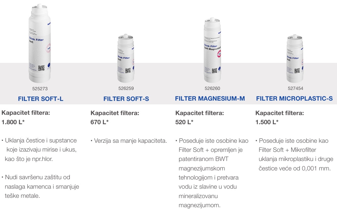 Filter optimizuje vodu za piće. Opremljen je patentiranom BWT magnezijumskom tehnologijom i pretvara vodu iz slavine u vodu mineralizovanu magnezijumom (BWT) u pet faza filtracije. Najbolja pijaća voda je ona koja nema boju, miris i ukus, a ovaj filter će pomoći da se ne baš savršena voda iz vodovoda oslobodi tih karakteristika. Uklanja čestice i supstance koje izazivaju mirise i ukus, kao što je na primer hlor. Takođe nudi savršenu zaštitu od naslaga kamenca, smanjuje teške metale i obogaćuje vodu vrednim mineralom magnezijumom. Filter je fantastičan za filtriranje vode u kuhinji, ugrađen u BLANCO sistem za vodu ili filter.