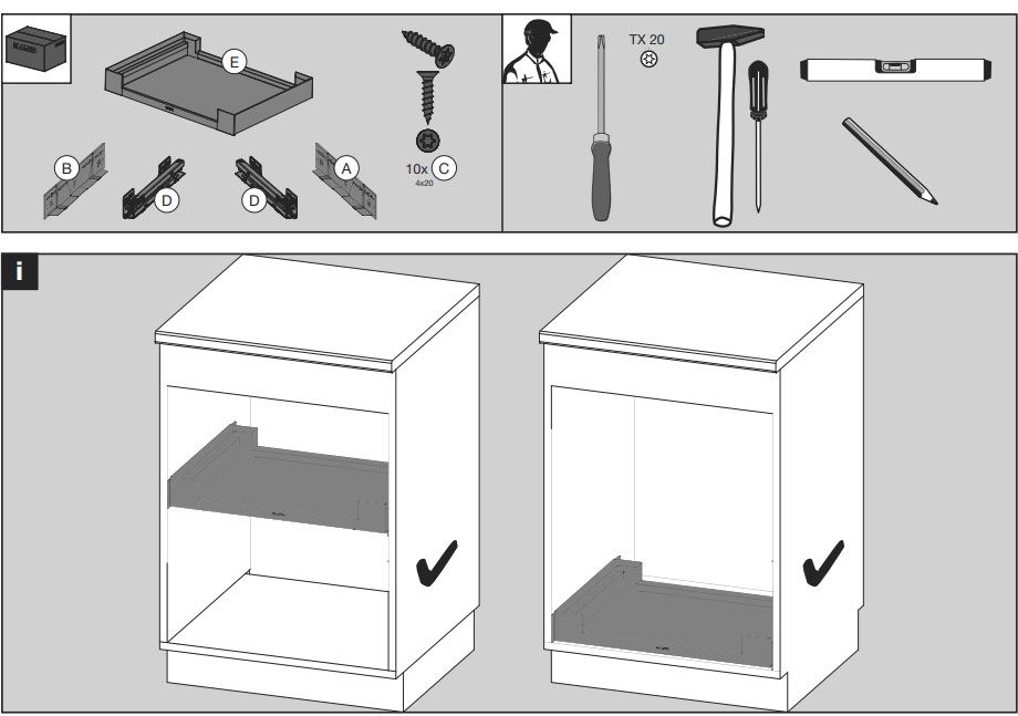 Dostupna za ormariće sa izvlačenjem (P) i sa vratima na šarkama širine 60 cm (H).