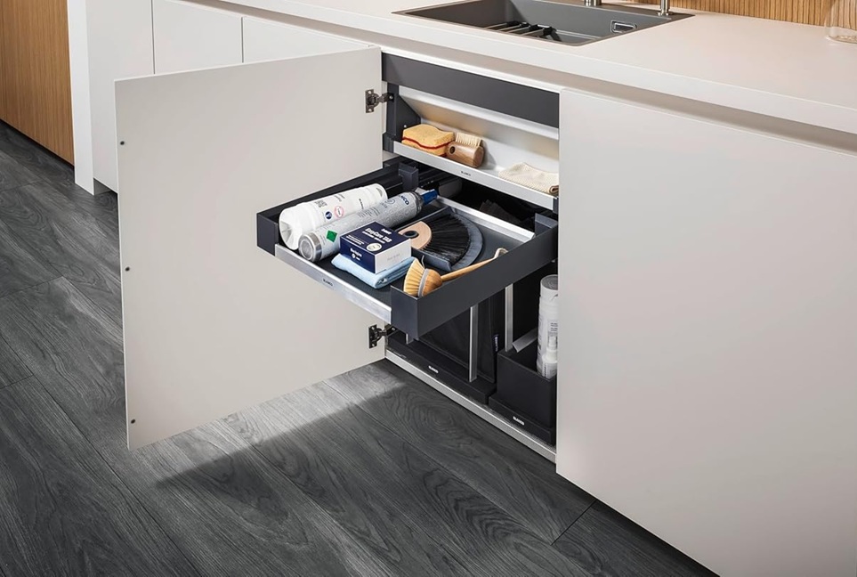 Fioka sa mehanizmom za meko zatvaranje nudi prostor za skladištenje u srednjem delu donjeg ormarića.