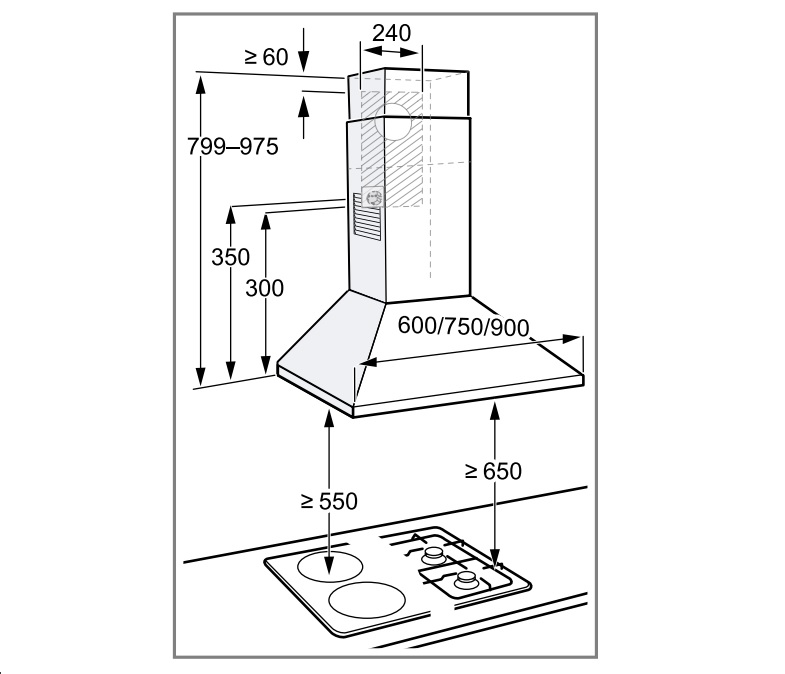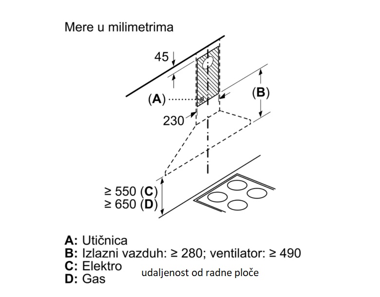 - Preporučena minimalna udaljenost od ploče na gas: 65 cm