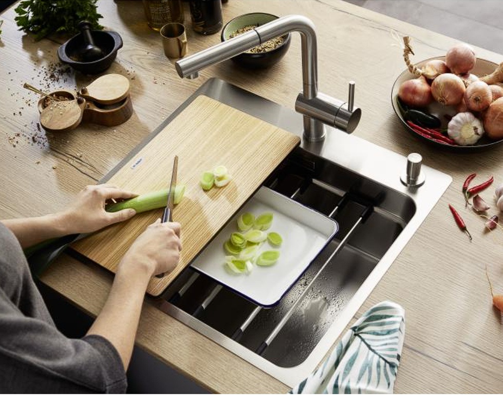 - Zahvaljujući integrisanom međustepeniku, i uz šine koje se isporučuju uz sudoperu ovo korito postaje multifunkcionalno i omogućuje rad na 3 nivoa: Na dnu korita, na međuetaži, i na ivici korita.