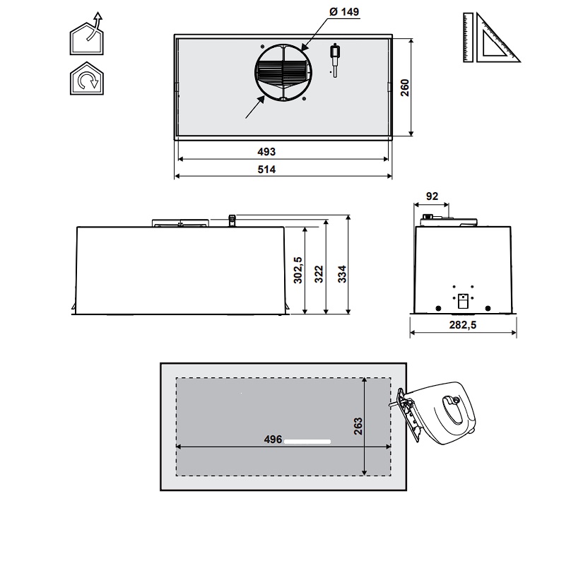 - Kružno usisavanje (Perimetarsko): Sistem usisavanja je raspoređen po ivicama aspiratora, što nudi maksimalnu efikasnost. Usisna površina je sakrivena panelom radi elegantnijeg izgleda.