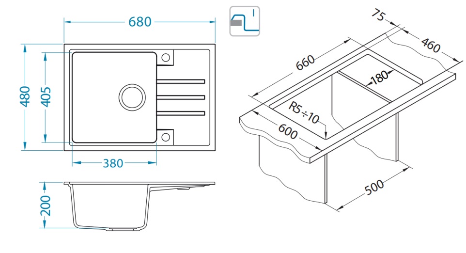 ALVEUS GRANITNA SUDOPERA INTERMEZZO 40, ARCTIC 680x480/200mm