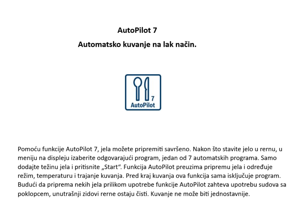 - AutoPilot 7: preuzima pripremu jela i određuje režim, temperaturu i trajanje kuvanja. Pred kraj kuvanja ova funkcija sama isključuje program.